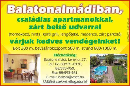Családias 2-4 férőhelyes, önálló, teljesen felszerelt (fürdő, WC, konyha, TV) teraszos apartmanok. A belső udvaron játszótér, lengőteke, medence (3X7m) és grillezési lehetőség. Zárt parkoló biztosított. Gyógymasszázs és kerékpárkölcsönzés a helyszínen. A Balaton 800 m, bevásárló központ 200 m, városközpont 800 m.