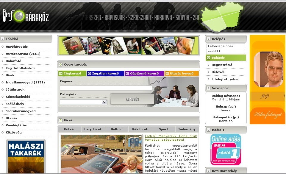 Az InfoRábaköz-ön híreket, közérdekű adatokat, traffipax információkat, horoszkópot olvashat, pontos információkat kaphat az aktuális környékbeli programokról, melyekről képes beszámolót is készítünk. Az InfoRábaköz-ön mindenki ingyenesen feladhatja autós-, ingatlan- vagy apróhirdetését, játszhat, szavazhat, fórumozhat, és megtalálja a legismertebb éttermek napi menü ajánlatát is. Az InfoRábaköz elsőként és egyedülállóan mutatja be a rábaközi újszülötteket képekben. -
